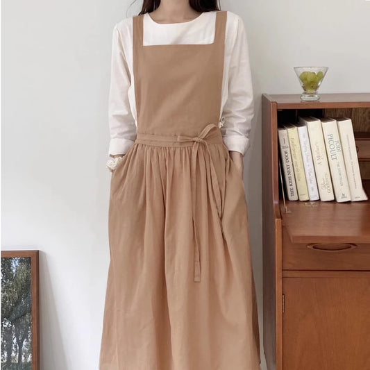 [apron] Waterdrop Women Cotton Linen Cross Back Apron with Pockets for Gardening Works Pinafore Dress